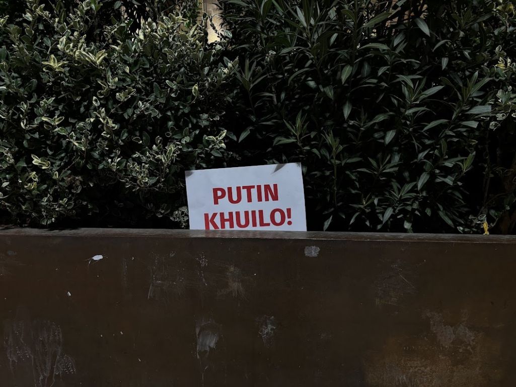 Nad wywieszonymi tam flagami Gruzji, Unii Europejskiej, Ukrainy i USA widnieje plakat z napisem: „Sanctions – Putin’s puppet Ivanishvili [Bidzina Iwaniszwili – oligarcha i założyciel rządzącej partii Gruzińskie Marzenie] and his pro-Russia government”. Obok – kolejne protestacyjne banery i dwa namioty.
