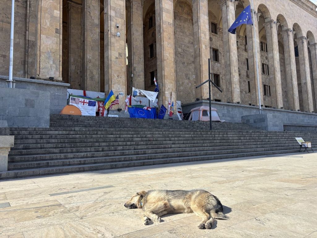 Nad wywieszonymi tam flagami Gruzji, Unii Europejskiej, Ukrainy i USA widnieje plakat z napisem: „Sanctions – Putin’s puppet Ivanishvili [Bidzina Iwaniszwili – oligarcha i założyciel rządzącej partii Gruzińskie Marzenie] and his pro-Russia government”. Obok – kolejne protestacyjne banery i dwa namioty.