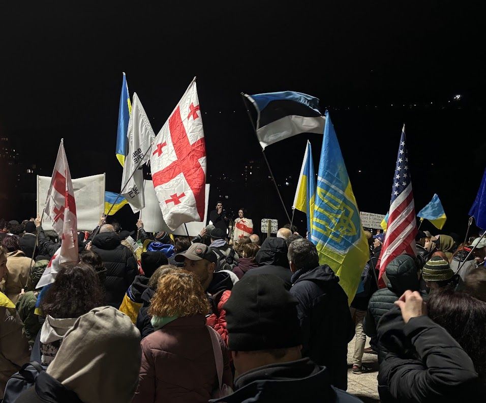 Już wieczorem, w rocznicę pełnowymiarowej rosyjskiej inwazji na Ukrainę, przed ambasadą Ukrainy w Tbilisi zebrały się tłumy, by okazać solidarność Ukrainie.
